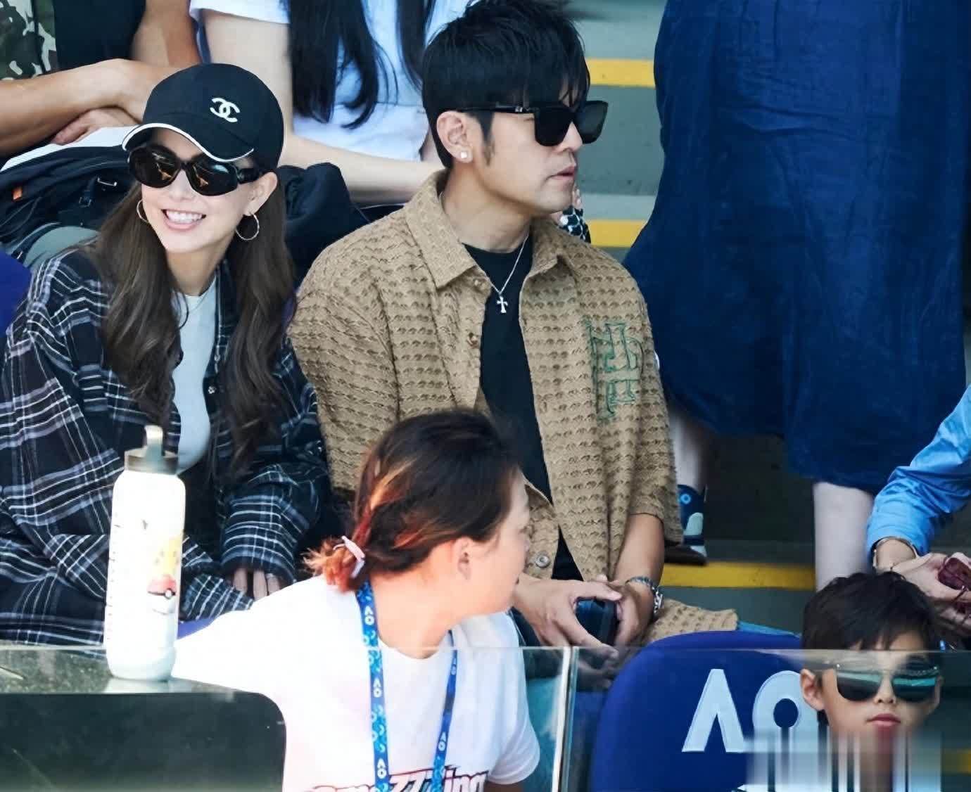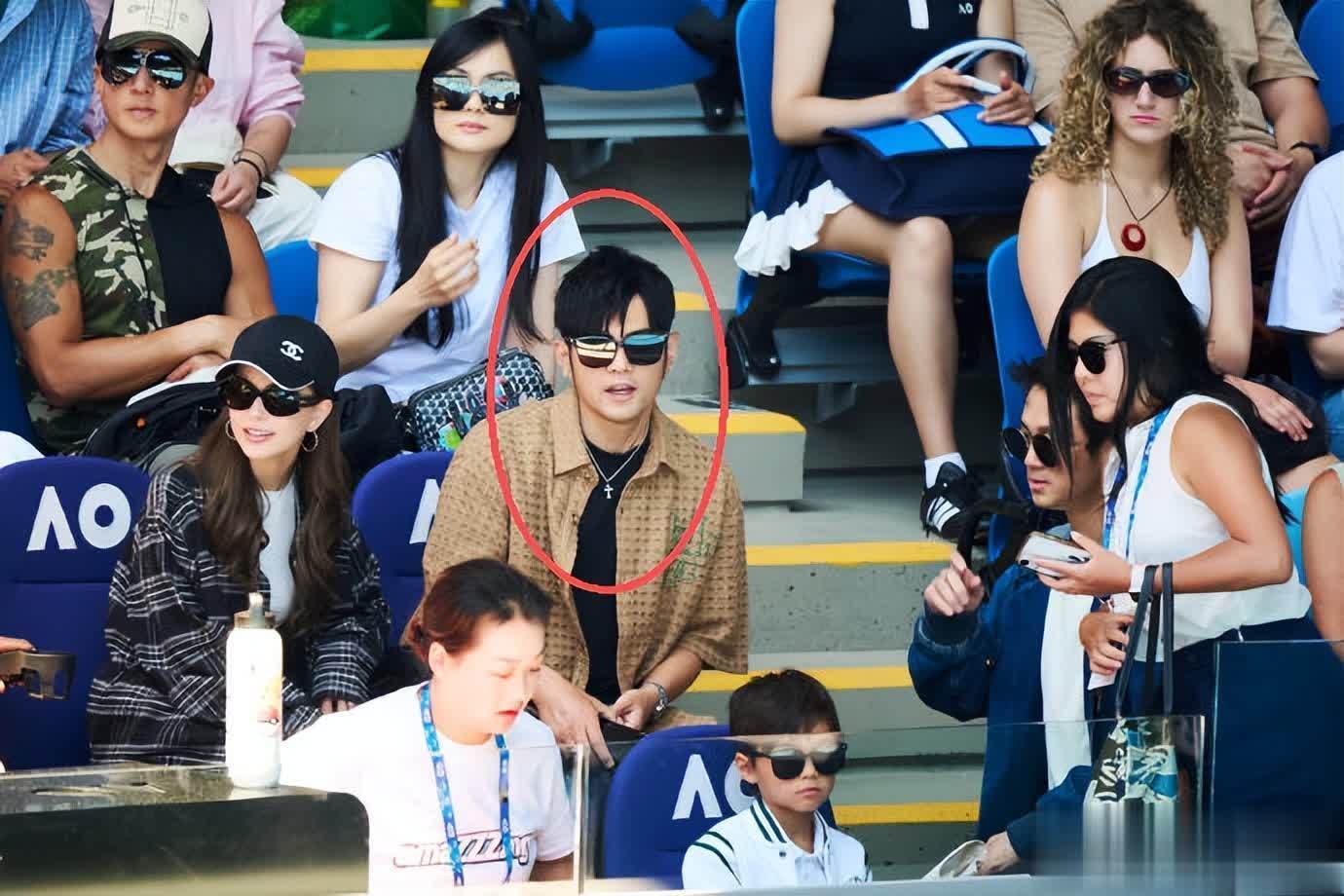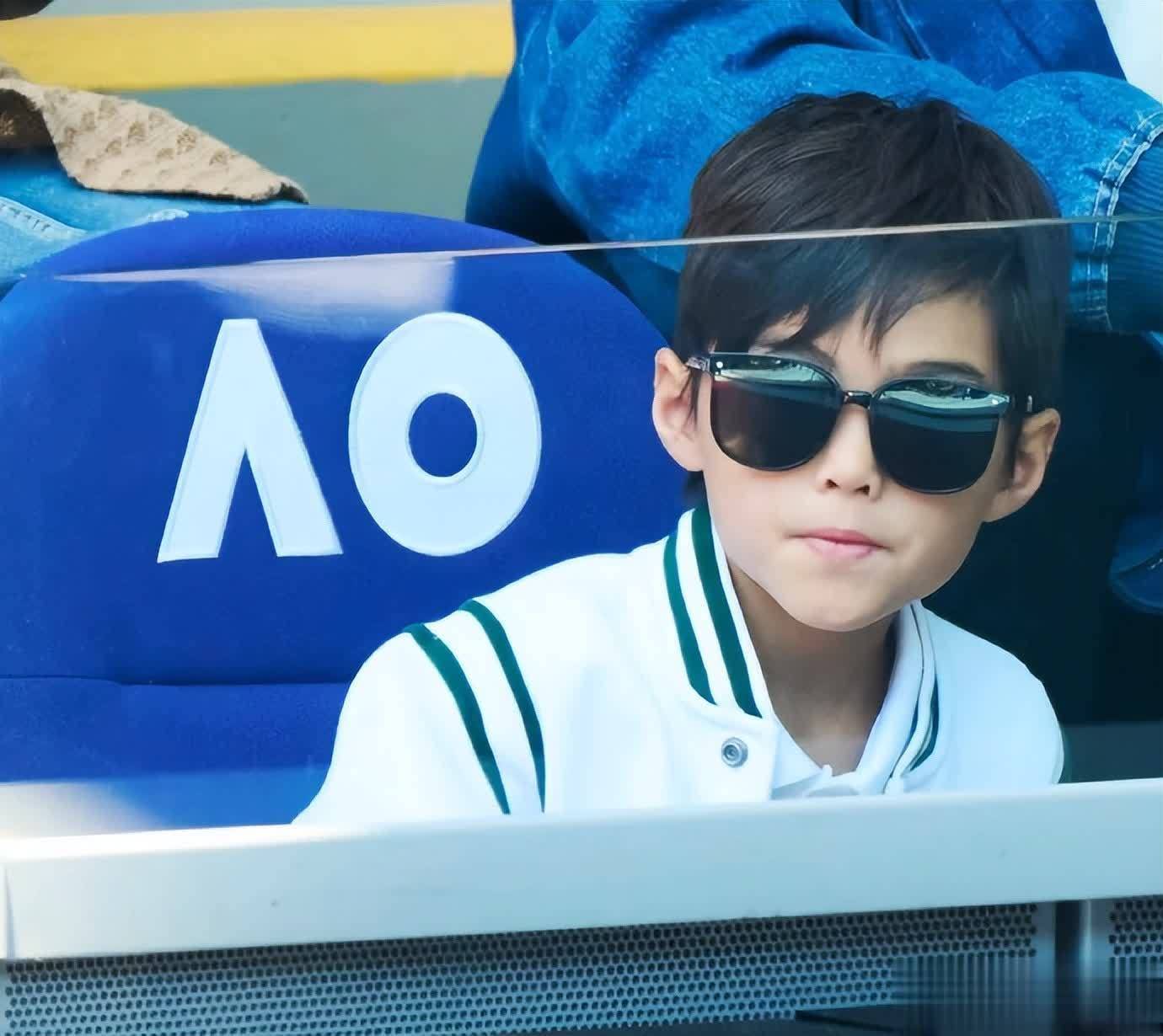 照片里的罗密欧戴着墨镜,和爸妈一起现身澳大利亚网球公开赛的观众席,一身白色棒球外套搭配清爽发型,小小年纪就气场十足,抿嘴时的神态和周杰伦如出一辙。